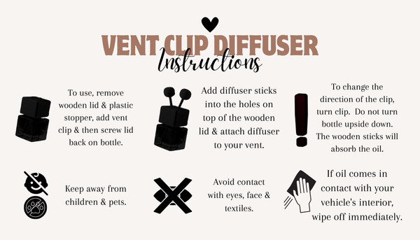 Car Diffusers are designed to last 2-3 MONTHS!! The 8ml bottles are filled with the scent of your choosing! Each diffuser will come in a clear package, labeled with the scent of your choosing. They will also include a card with instructions as pictured. Packaging has a hole up top for easy hanging.
