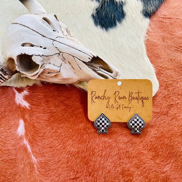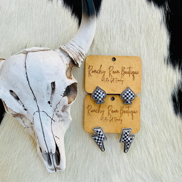 • Unique spade shape for a distinctive Western look • Bold black-and-white checker pattern adds modern flair • Lightweight and comfortable for everyday wear • Versatile accessory that complements any Western wardrobe • Perfect for boutique owners looking to offer trendy, eye-catching jewelry for their customers