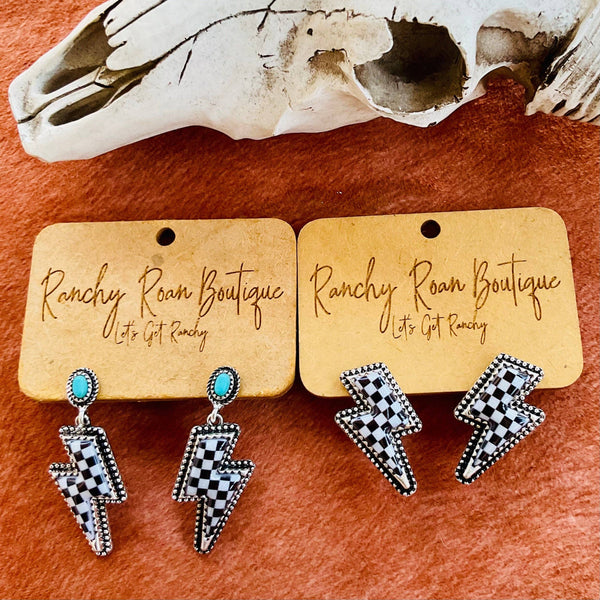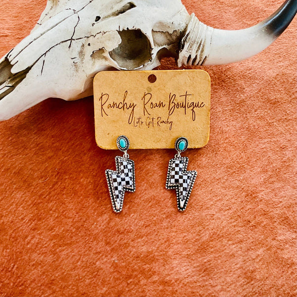 • Lightning bolt design for a bold, Western-inspired look • Black-and-white checker pattern adds a modern touch • Turquoise accent stone provides a pop of color and authenticity • Lightweight, comfortable earrings ideal for all-day wear • Designed to stand out in any Western wardrobe, perfect for boutique owners seeking unique, eye-catching accessories